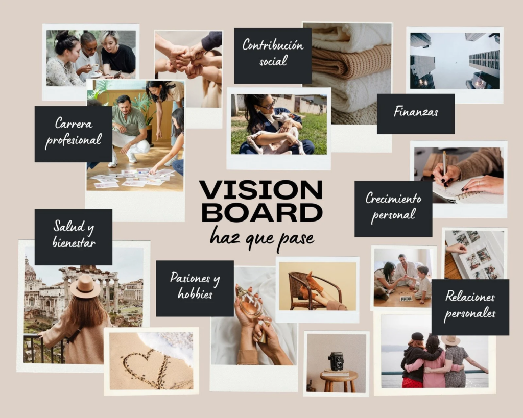 Un vision board es un tablero estilo collage donde se colocan en forma de imágenes todos los proyectos o metas que desees cumplir en el corto, mediano y/o largo plazo. Visualizar nuestras metas con imágenes ayuda a que se puedan cumplir, esto se debe a que al generar una imagen mental o el “ensayo mental” (imaginar realizar una acción) activa las mismas áreas cerebrales que cuando realmente se ejecuta esa acción física y ayuda a la motivación.